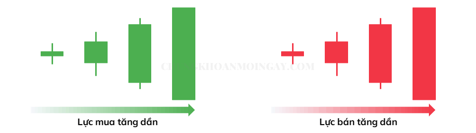 Biểu đồ nến có nhiều cỡ thân khác nhau. Ví dụ như thân nến dài thể hiện lực Mua hoặc Bán mạnh.