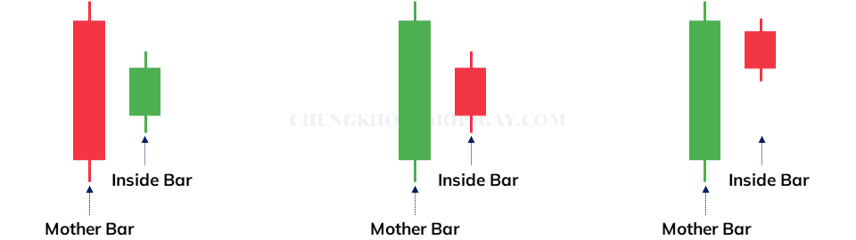 Một Inside Bar bắt buộc phải nằm toàn bộ trong cây nến vừa trước nó, được gọi là nến mẹ – Mother Bar. Nói cách khác, nến Inside Bar phải có đỉnh thấp hơn và đáy cao hơn nến trước.
