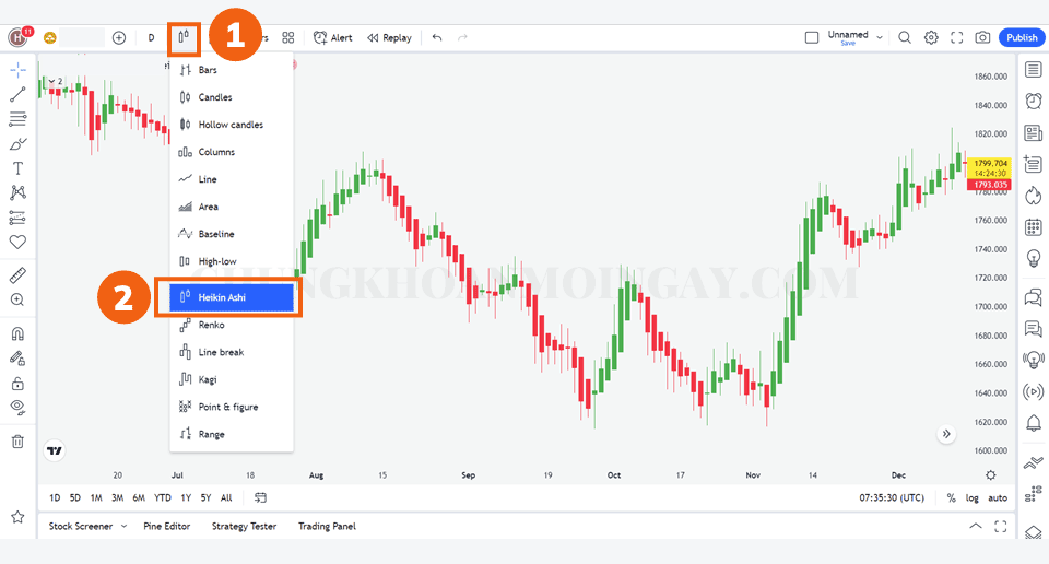 Vào biểu tượng thanh nến (1) → Chọn “Heikin Ashi” như hình bên dưới.