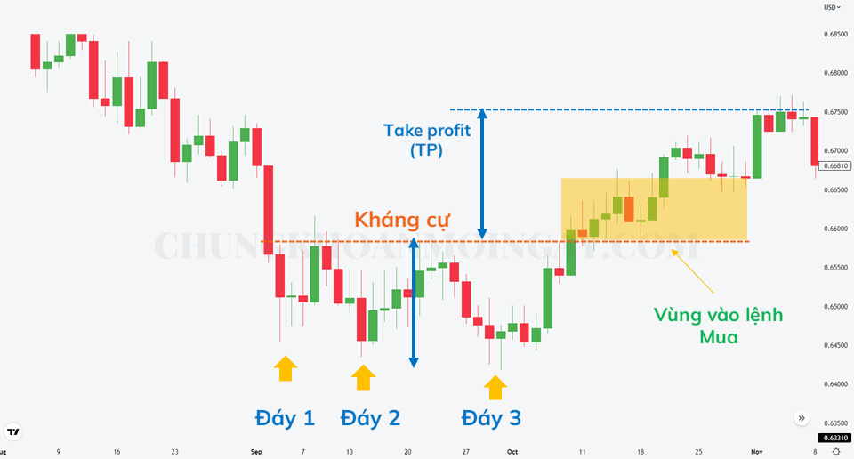 Nhìn ví dụ trên ta nhận thấy mô hình giá Ba Đáy đã xuất hiện. Tại đường kháng cự (Resistance), giá đã phá qua và hồi test trở lại. Đây là vùng để vào lệnh Mua đẹp.