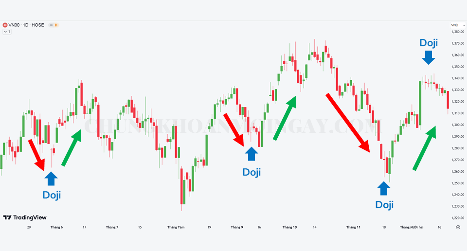 Trong biểu đồ chỉ số VN30, D1 bên trên, sẽ có nhiều cơ hội giao dịch nếu chúng ta chờ đợi phía sau cây nến Doji là một cây nến giảm thì sẽ xác nhận xu hướng đảo chiều từ tăng sang giảm hoặc ngược lại, sau cây nến Doji là một cây nến tăng thì nó xác nhận xu hướng đảo chiều từ giảm sang tăng.