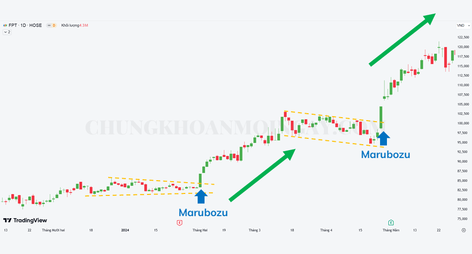 Tiếp theo, biểu đồ cổ phiếu FPT khung thời gian ngày (D1) xuất hiện nến Marubozu sau quá trình tích lũy (hình thành mô hình tam giác), cho thấy lực Mua vào vẫn đang rất mạnh và xu hướng tăng vẫn còn tiếp diễn. Lúc này, nến Marubozu thể hiện là cây nến dẫn đường, chúng ta có thể canh mua sau cây nến Marubozu.