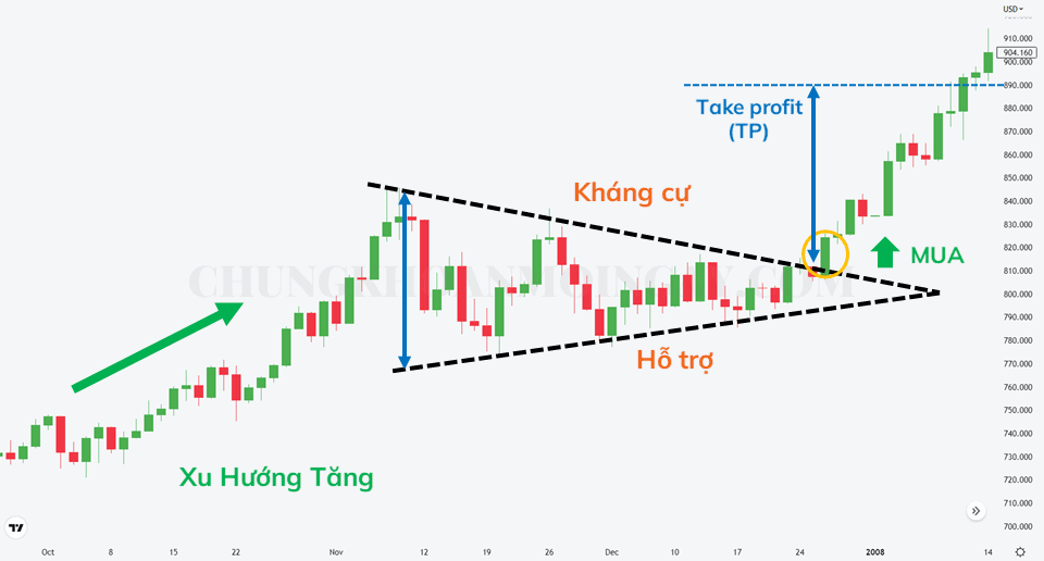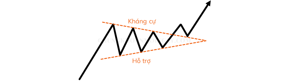 Sau đó, giá lại cố gắng vượt qua mức đỉnh trước đây và khi đó, bên bán lại nhanh chóng tham gia thị trường và bán ra. Nếu bạn nối các đỉnh và đáy với các đường hỗ trợ và kháng cự, bạn sẽ có một hình tam giác. Tình thế thị trường sẽ tự lặp lại, sóng giảm kết thúc thậm chí còn sớm hơn sóng trước đó và là dấu hiệu cho thấy những thành phần tham gia thị trường đang sốt sắng mua vào. Sóng tăng phá vỡ các đường cạnh của tam giác và hoàn thiện mô hình giá.