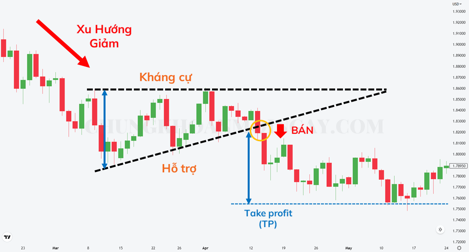 Cạnh dưới của nó (đường hỗ trợ) nằm ngang. Sau khi mô hình Tam Giác hướng xuống được tạo thành, thị trường tiếp tục xu hướng đi xuống.