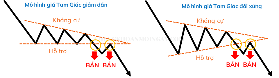 Tương tự, một mô hình giá Tam Giác giảm dần, với các mức cao thấp hơn, là một mô hình giảm giá. Nó cho thấy thị trường dừng trong một xu hướng giảm.