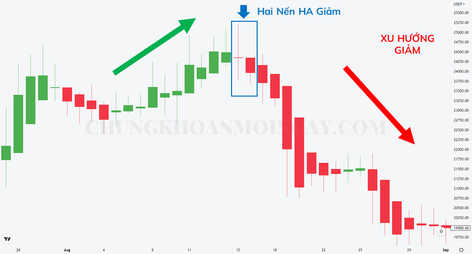Tương tự, dưới đây là tổng hợp những mô hình 2 nến Heiken Ashi đảo chiều giảm thường thấy trong các biểu đồ giao dịch.
