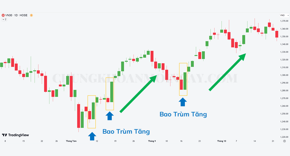 Mô hình nến Bao Trùm Tăng trái ngược với mô hình nhấn chìm giảm. Mô hình tăng xuất hiện sau một cây nến giảm được kèm theo sau bằng một cây nến tăng mạnh.