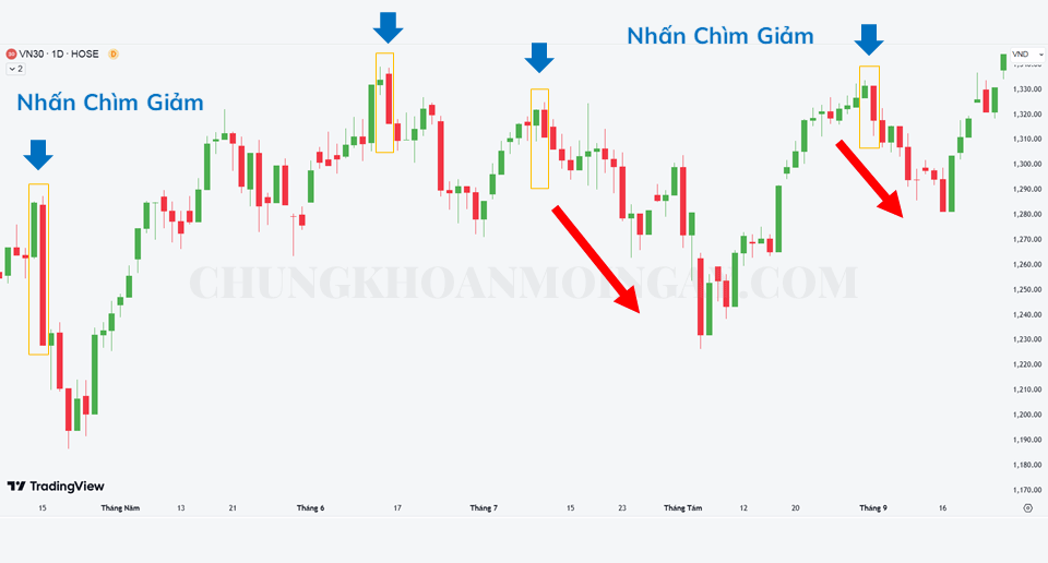 Cây nến giảm xuất hiện sau “nhấn chìm” hoàn toàn cây nến tăng phía trước. Điều này có nghĩa là bên Bán đã quyết định đẩy giá xuống mạnh sau một giai đoạn tăng giá hoặc đi ngang (sideway).