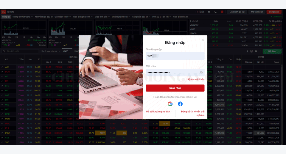 Sau khi mở tài khoản và xác minh danh tính, hoàn thành hợp đồng với công ty chứng khoán SSI. Bạn sẽ được cấp một tài khoản giao dịch chứng khoán cơ bản và tài khoản ký quỹ. Tiếp theo, tiến hành đăng nhập vào các nền tảng giao dịch hiện có trên sàn SSI. Truy cập trang https://iboard.ssi.com.vn/, hệ thống hiển thị màn hình “Đăng Nhập Hệ Thống”