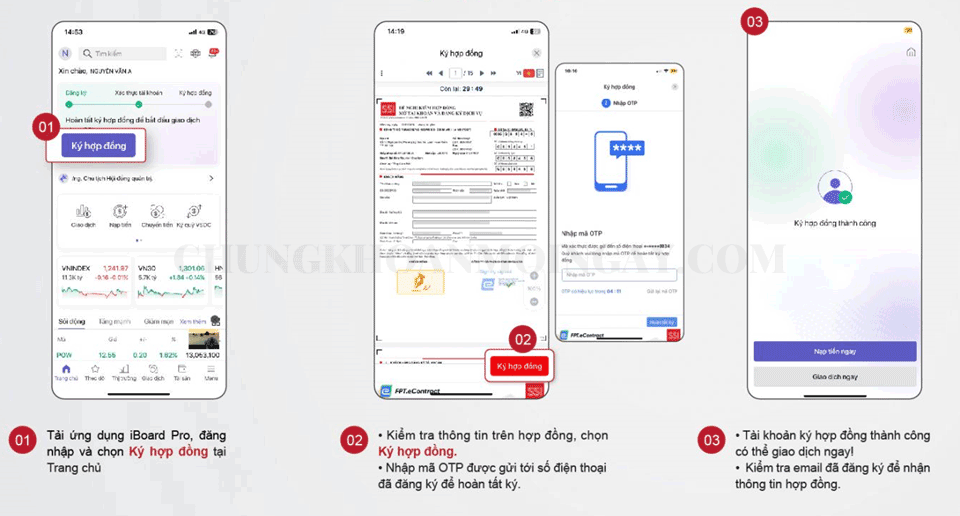 Sau khi cài đặt ứng dụng iBoard Pro về điện thoại, bạn thực hiện đăng nhập vào tài khoản và chọn Ký hợp đồng tại Trang chủ. Bạn cần đọc kỹ các thông tin điều khoản hợp đồng. Sau đó, tick “Tôi đã đọc…” và nhấn “Ký hợp đồng”. Nhập mã OTP được gửi tới số điện thoại đã đăng ký để hoàn tất ký.