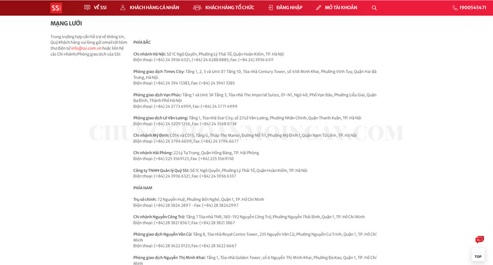 Hiện tại SSI đang chỉ có trụ sở tại 2 thành lớn của Việt Nam là TP. Hồ Chí Minh và Hà Nội. Nếu bạn yêu cầu gì về trụ sở của SSI có thể thông qua kênh gửi thử hoặc gọi điện đến trụ sở của SSI để biết thêm thông tin cần thiết.